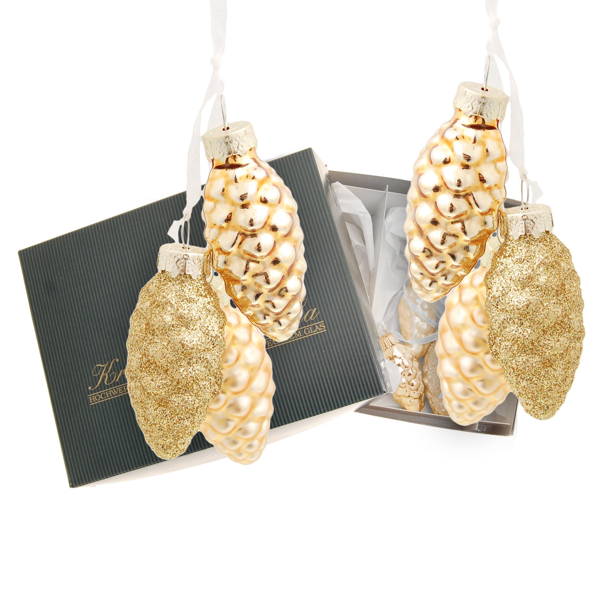 Titel | Baumschmuck Tannenzapfen Mini-Set mit Band Goldfarbig 4cm |