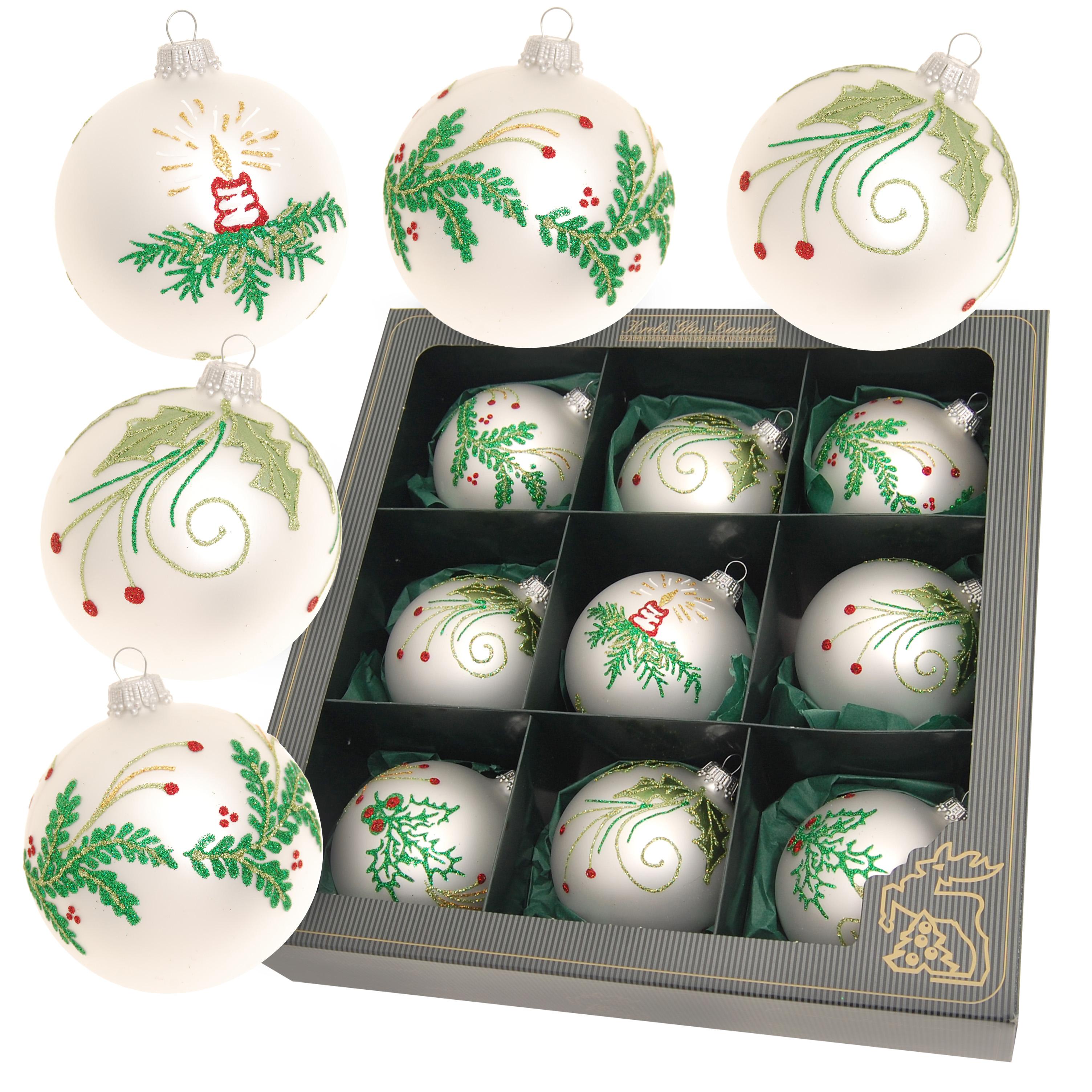 Das Glaskugelsortiment "Silberne Weihnachtsnacht" besteht aus 9 handdekorierten Baumkugeln mit einem Durchmesser von 8cm. Jede Kugel in Silber Satin ist aus echtem Glas mundgeblasen und verfügt über ein zeitloses Design mit Weihnachtsstern- und Kerzendekor in Grün-Glitter. Diese klassischen Weihnachtsdekorationen sind perfekt für jeden Weihnachtsbaum und verleihen Ihrem Zuhause eine festliche Atmosphäre.