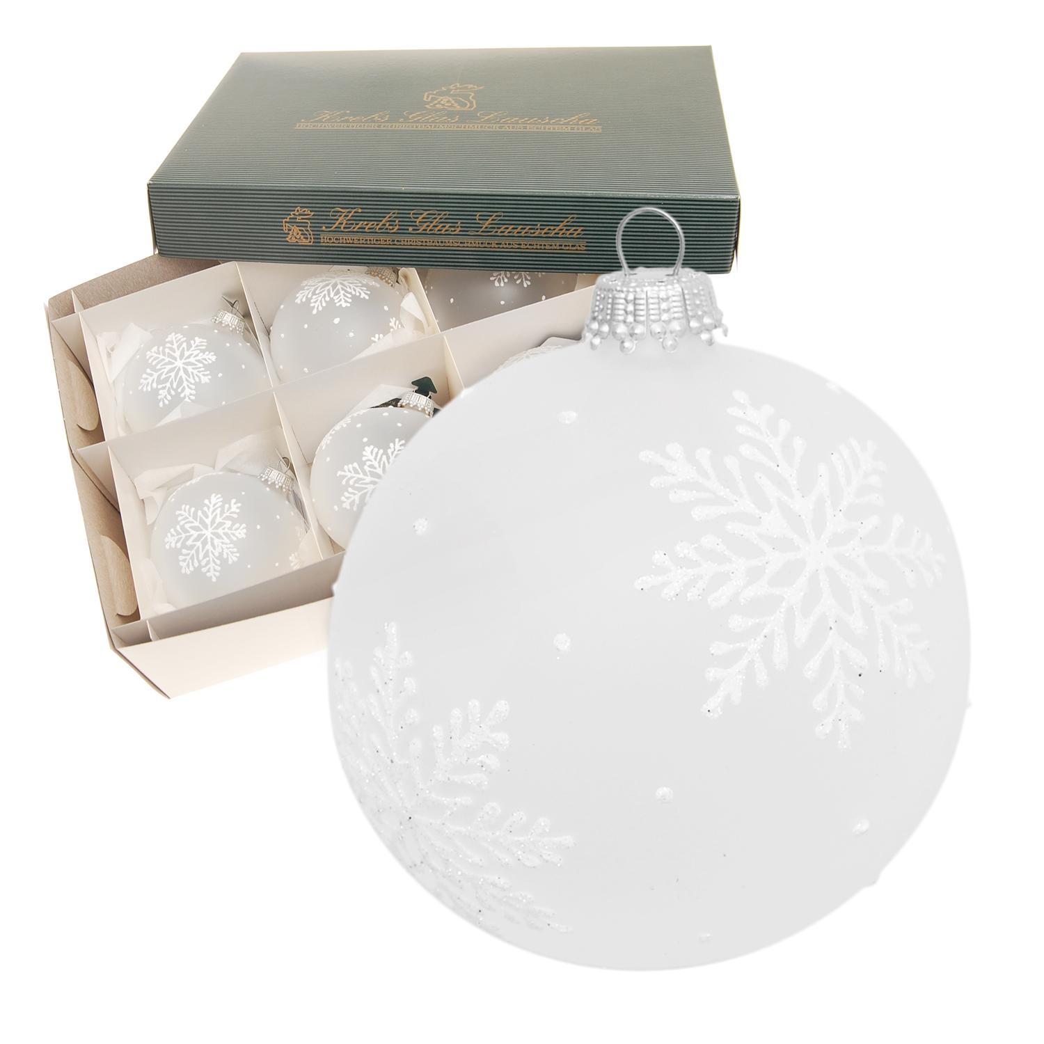 Jede Baumkugel ist handdekoriert und mundgeblasen. Dadurch ist jede Kugel ein Unikat und macht Ihr Weihnachtsbaum zu einem individuellen Kunstwerk. Die weißen Schneeflocken auf den Kugeln sind mit weißem Glitter veredelt und sorgen für eine winterliche Atmosphäre und bringen den Zauber der Weihnachtszeit in Ihr Zuhause.