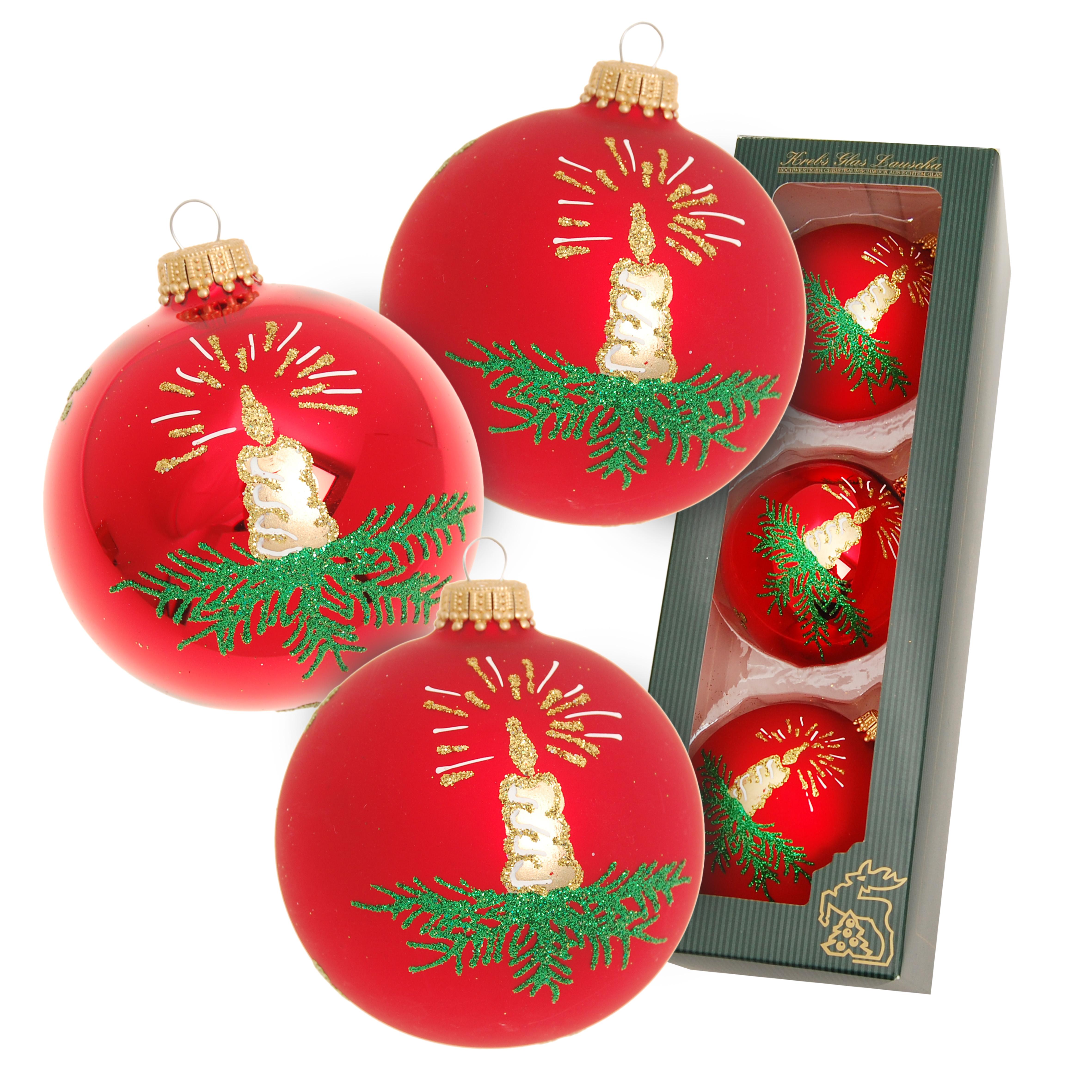 Verleihen Sie Ihrem Weihnachtsbaum mit diesem atemberaubenden Glaskugelset "Weihnachtskerze" Rot Satin/Glanz eine warme und gemütliche Atmosphäre. Dieses 3-teilige Set aus echtem Glas wurde mundgeblasen und von Hand dekoriert. Mit einer Größe von 8cm sind diese Baumkugeln die perfekte Ergänzung für Ihren Christbaumschmuck und Ihre Weihnachtsdekoration.