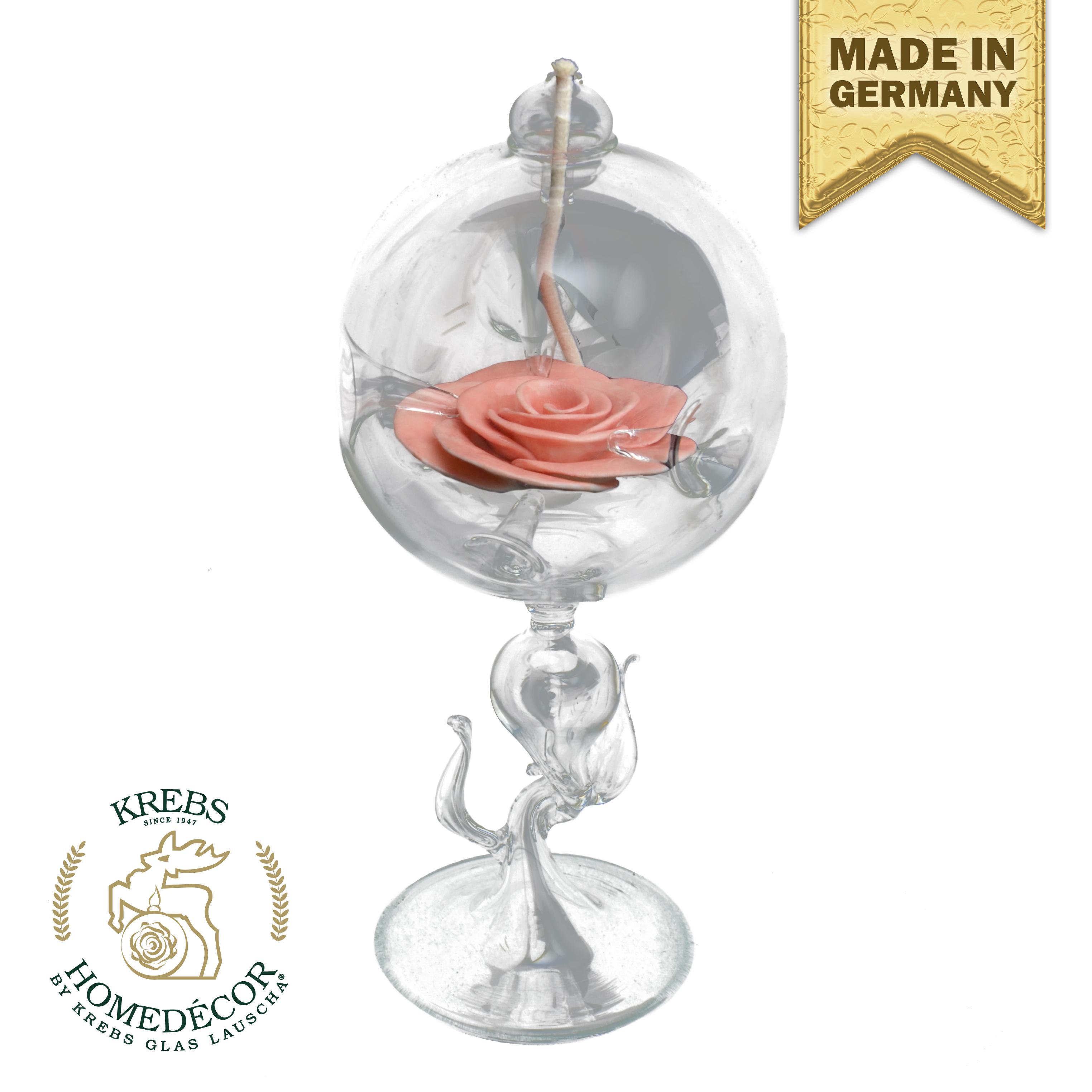 Die mundgeblasene Glas-Öllampe mit Fuß und handgeformter rosa Porzellanrose im Inneren ist ein außergewöhnliches Kunstwerk aus Lauscha, Deutschland, und ist Teil der Krebs Home Décor Linie.