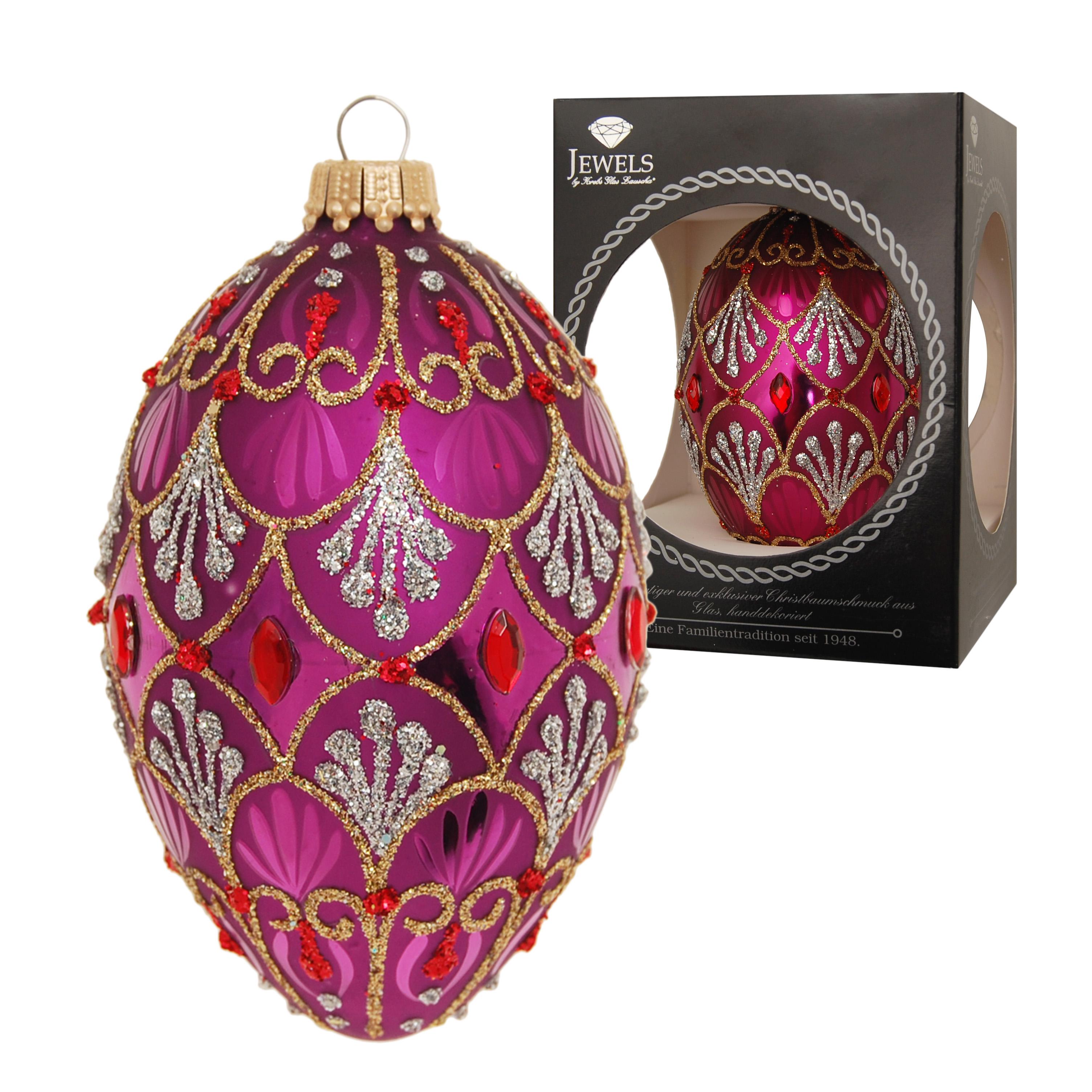 Mit dem "Glanz & Gloria" Weihnachtsbaumschmuck von Jewels by Krebs Glas Lauscha setzt Sie auf hochwertiges, mundgeblasenes Glas in einem satten Magenta-Ton mit einer edlen Goldverzierung und funkelnden roten Strasssteinen. Jedes einzelne 10 cm große Glas-Ei ist aufwendig dekoriert und erinnert mit seinen Kristallen im Swarovski Style an das Erbe von Fabergé.