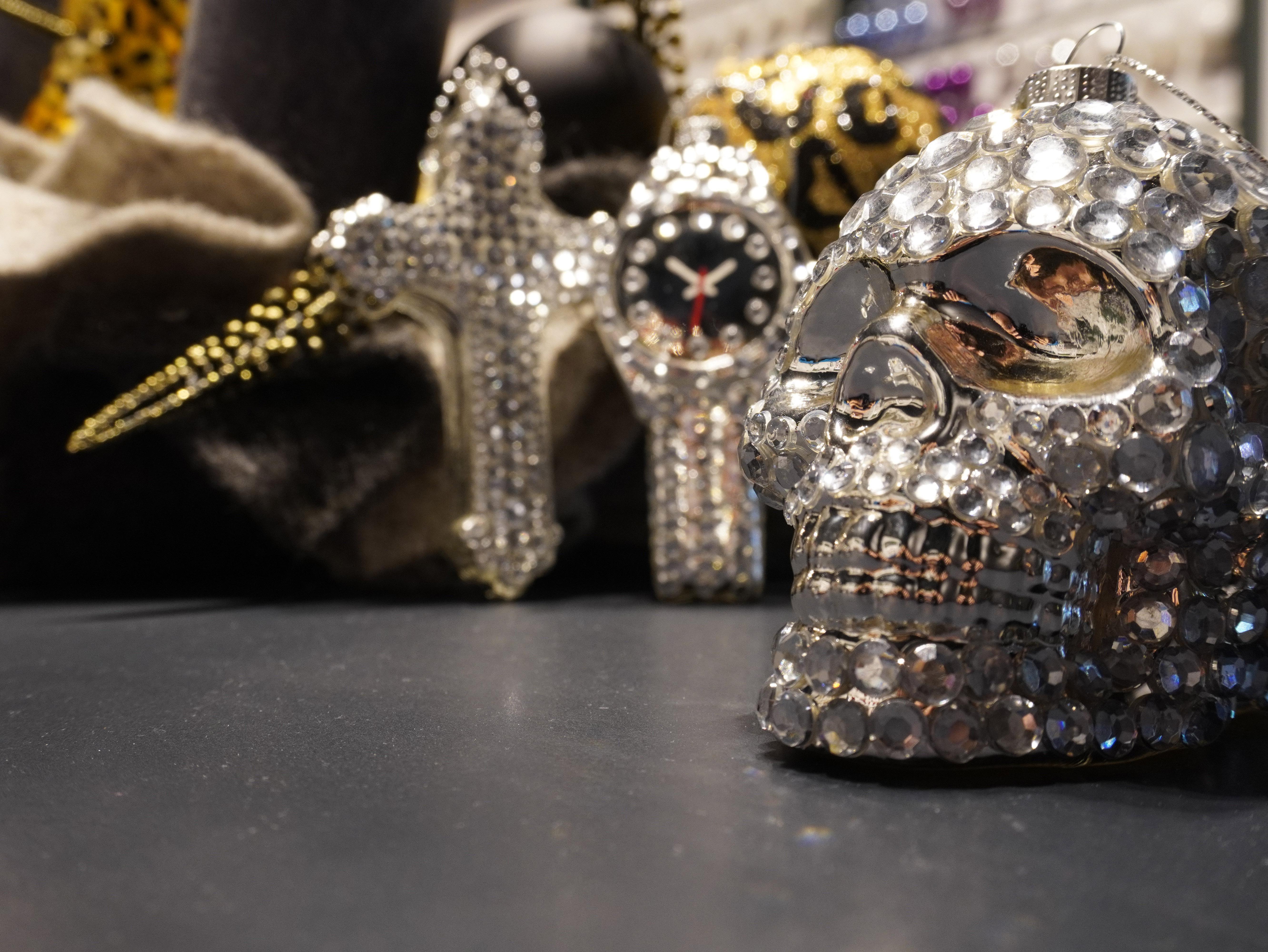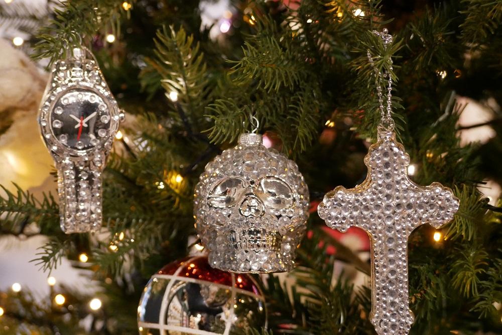 Das Design des Sub Culture Xmas Sets ist von der Subkultur inspiriert und verbindet moderne Elemente mit traditionellem Weihnachtsschmuck. Die Anhänger zeigen einen Totenkopf, eine Armbanduhr und ein Kreuz, die alle kunstvoll gestaltet sind und mit den funkelnden Strasssteinen perfekt in Szene gesetzt werden.