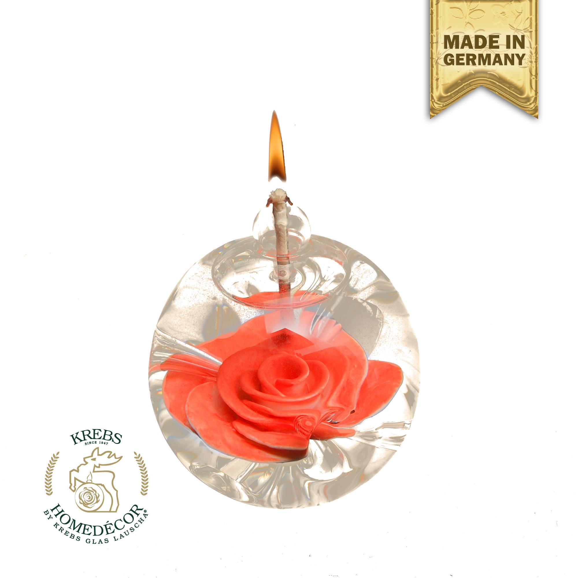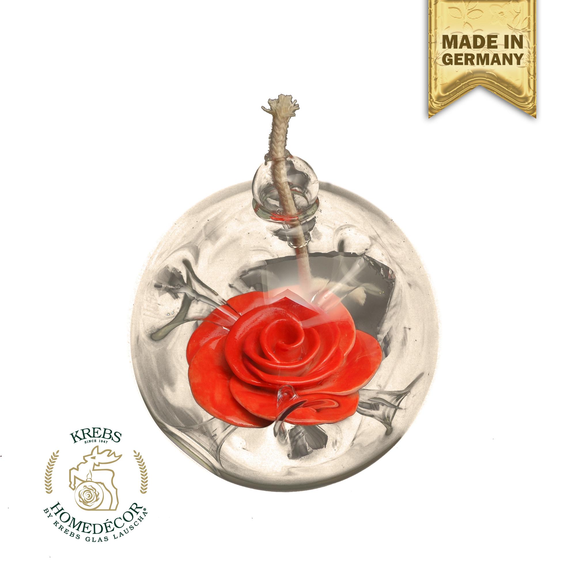 Die mundgeblasene Glas-Öllampe mit handgeformter roter Porzellanrose im Inneren ist ein einzigartiges Kunstwerk, das in Lauscha hergestellt wird und ist Teil der Krebs Home Décor Linie.