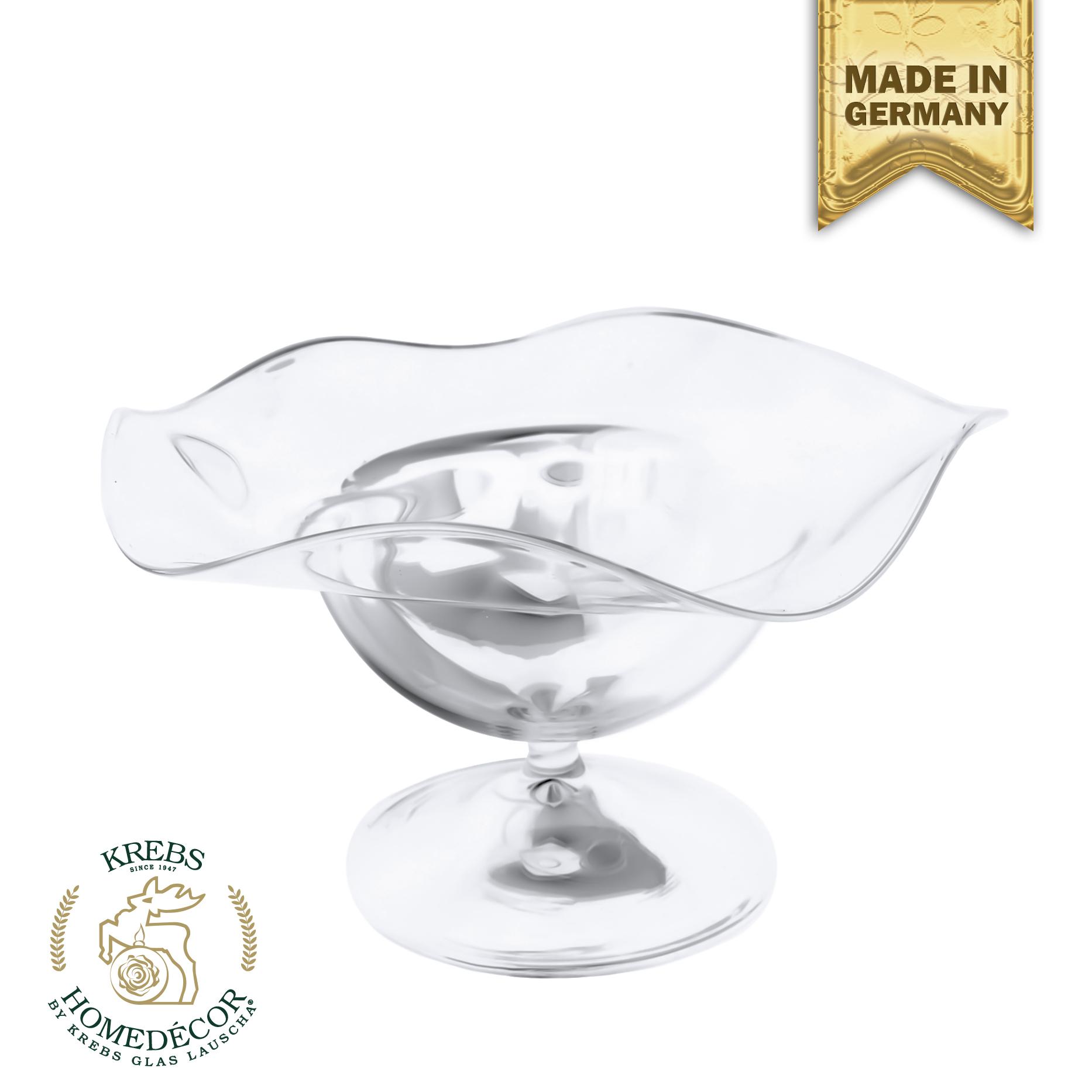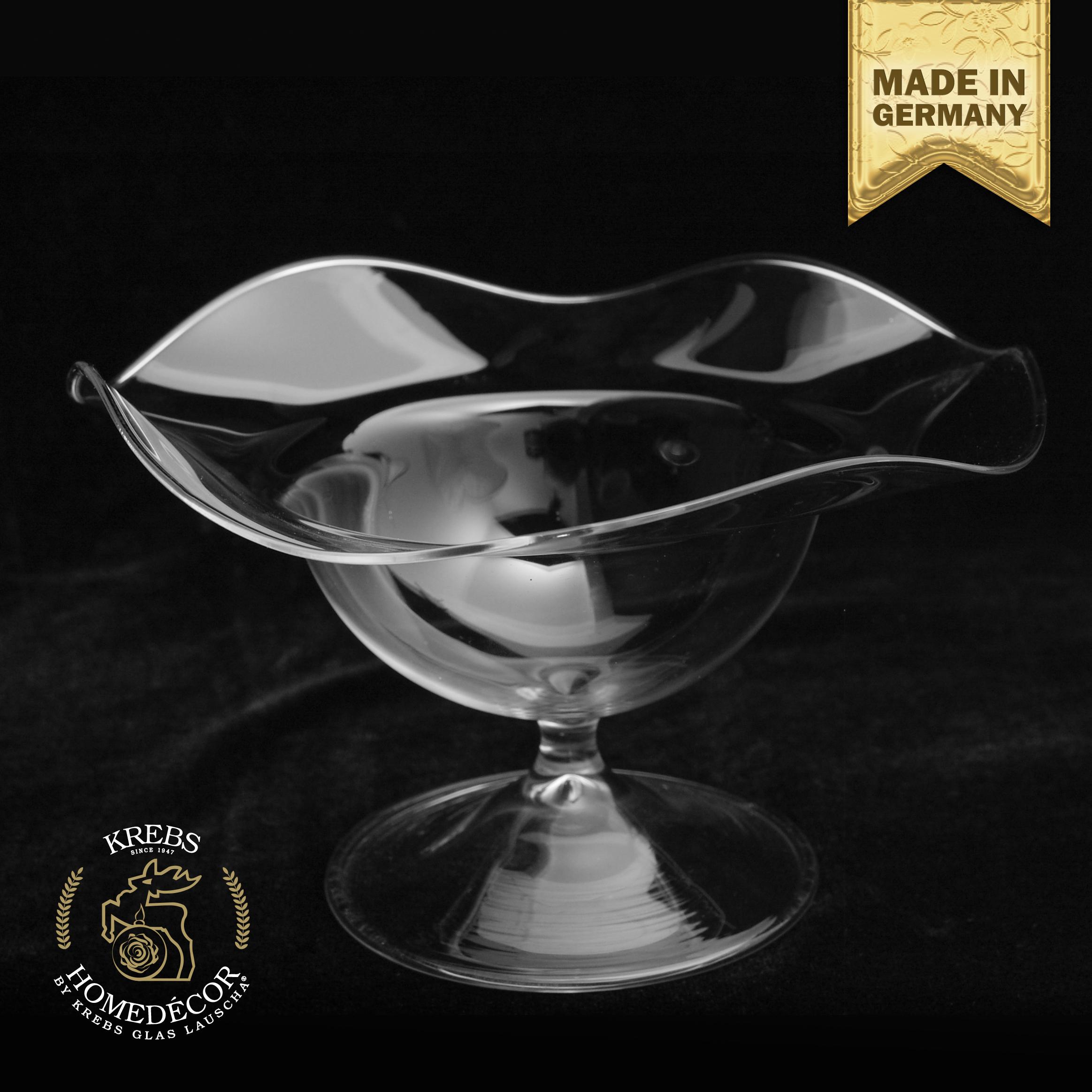 Das durchsichtige Glas ermöglicht es dem Betrachter, die Formenschönheit der geschwungenen Rosenblätter, die kunstvoll in den Schalenrand geformt ist, in all ihrer Pracht zu bewundern.