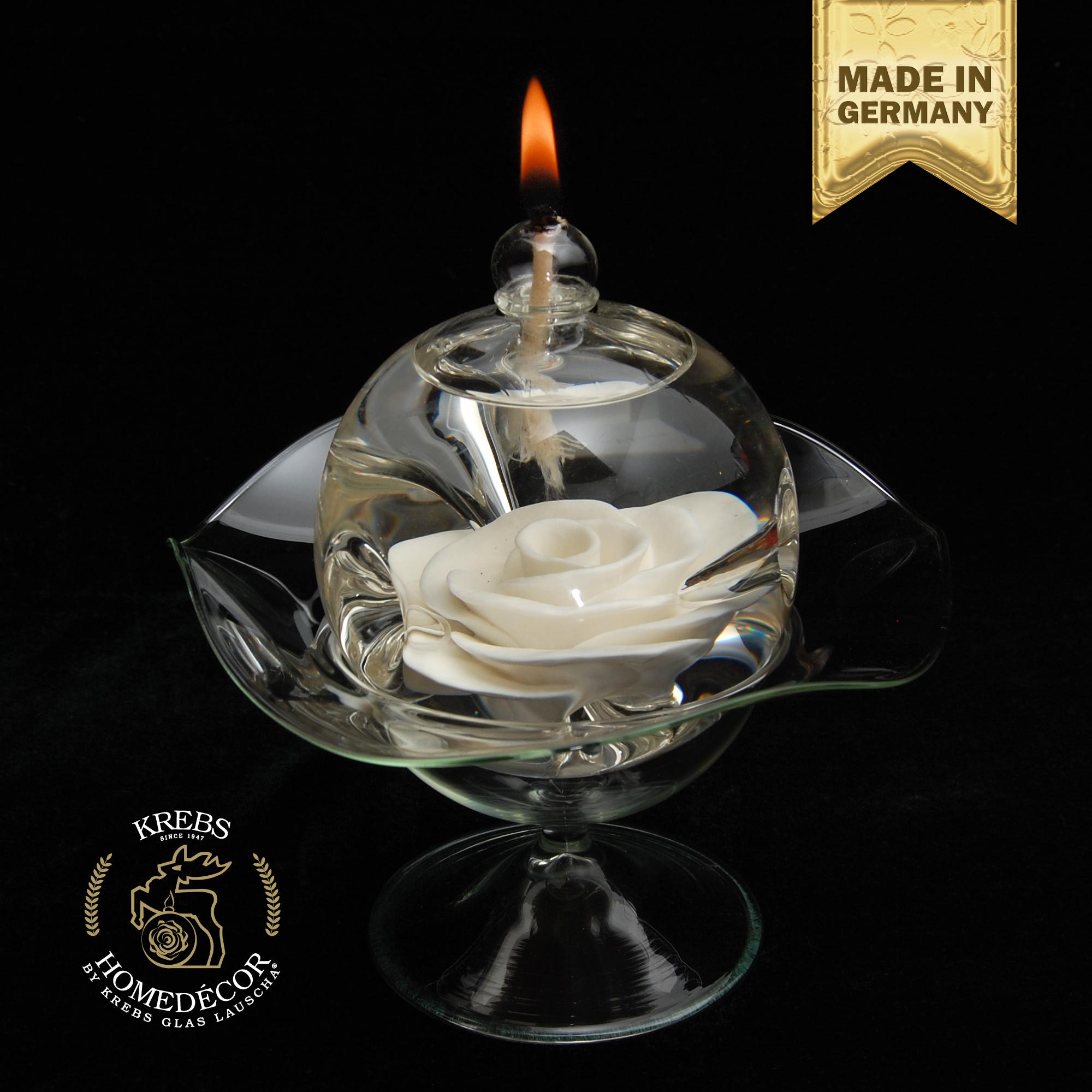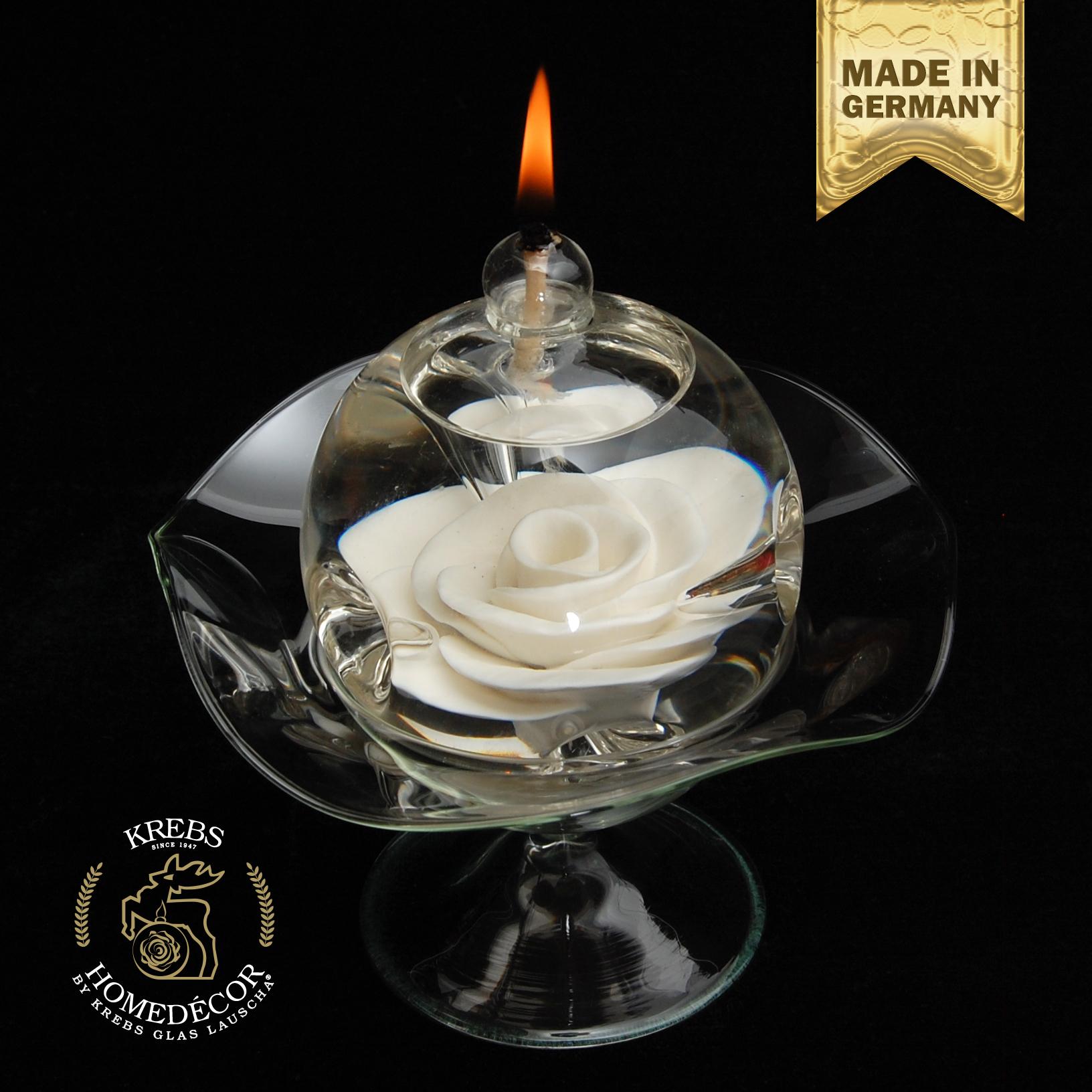 Die Rosen-Glasschale eignet sich als Dekorationselement zum Servieren von Gebäck, für frische Blumen, für Kerzen, als Schmuckschale oder als Präsentationsmöglichkeit für die Glas-Öllampe ohne Glasfuß.