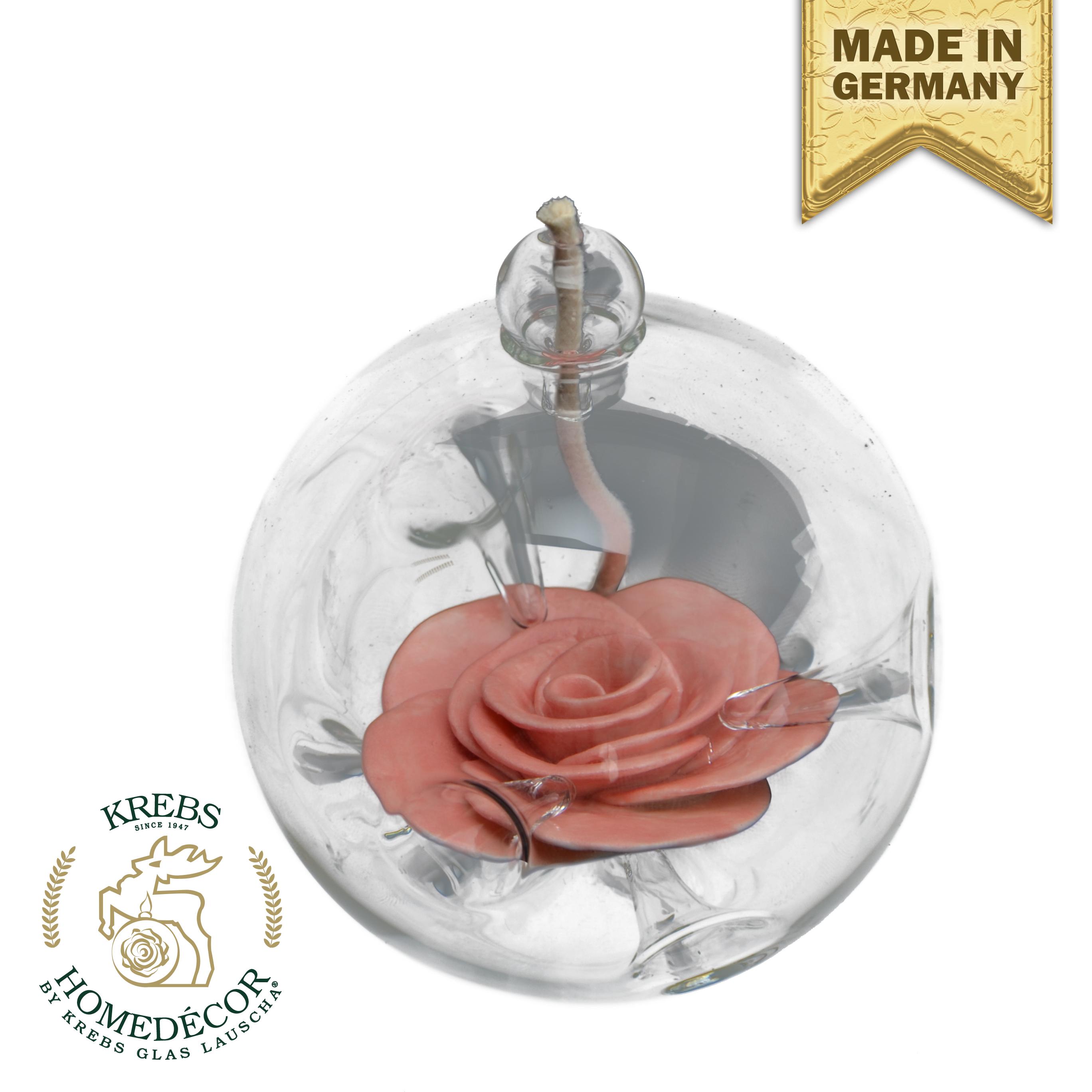 Die mundgeblasene Glas-Öllampe mit handgeformter rosa Porzellanrose im Inneren ist ein einzigartiges Kunstwerk, das in Lauscha hergestellt wird und ist Teil der Krebs Home Décor Linie.