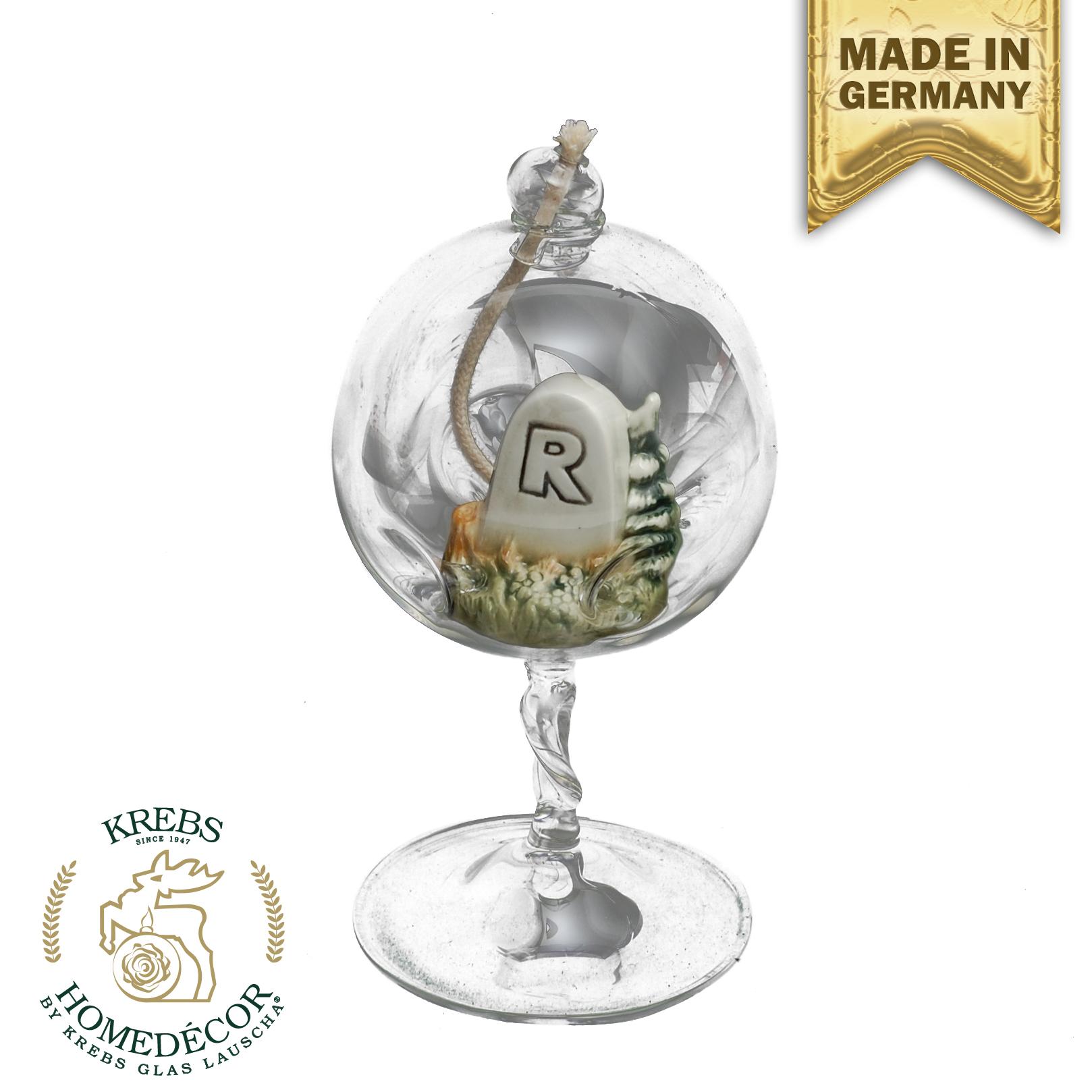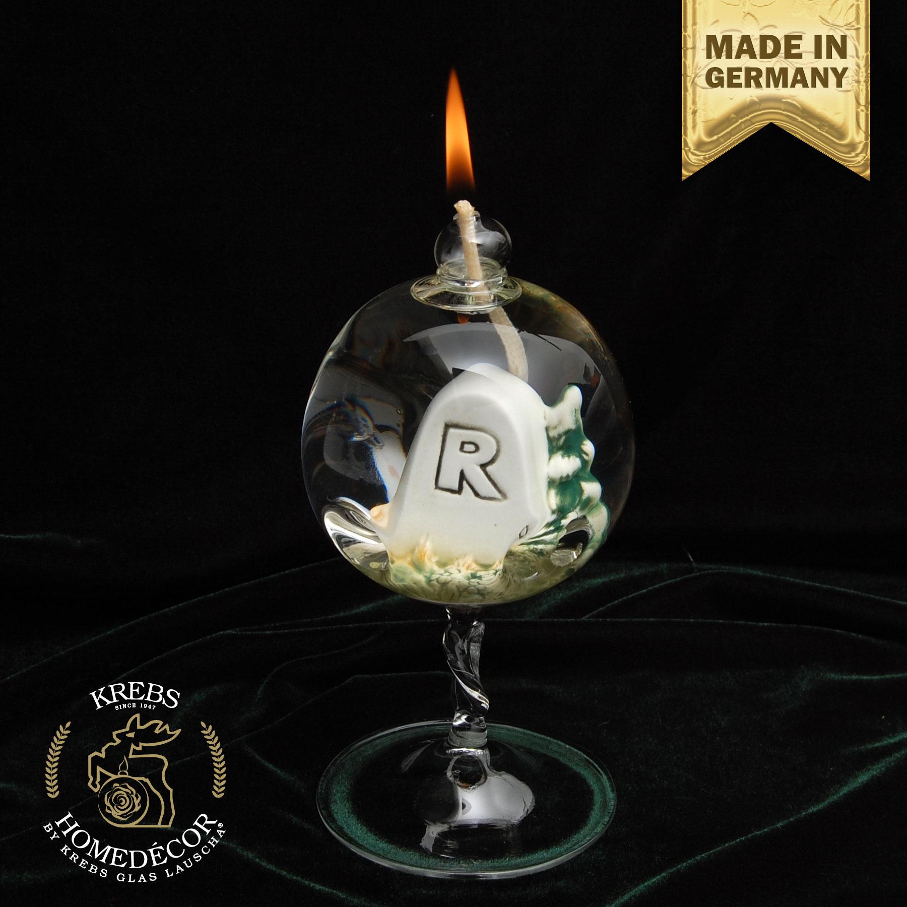 Die mundgeblasene Glas-Öllampe mit Fuß und handgeformtem Rennsteig-Stein im Inneren ist ein außergewöhnliches Kunstwerk aus Lauscha, Deutschland, und ist Teil der Krebs Home Décor Linie.