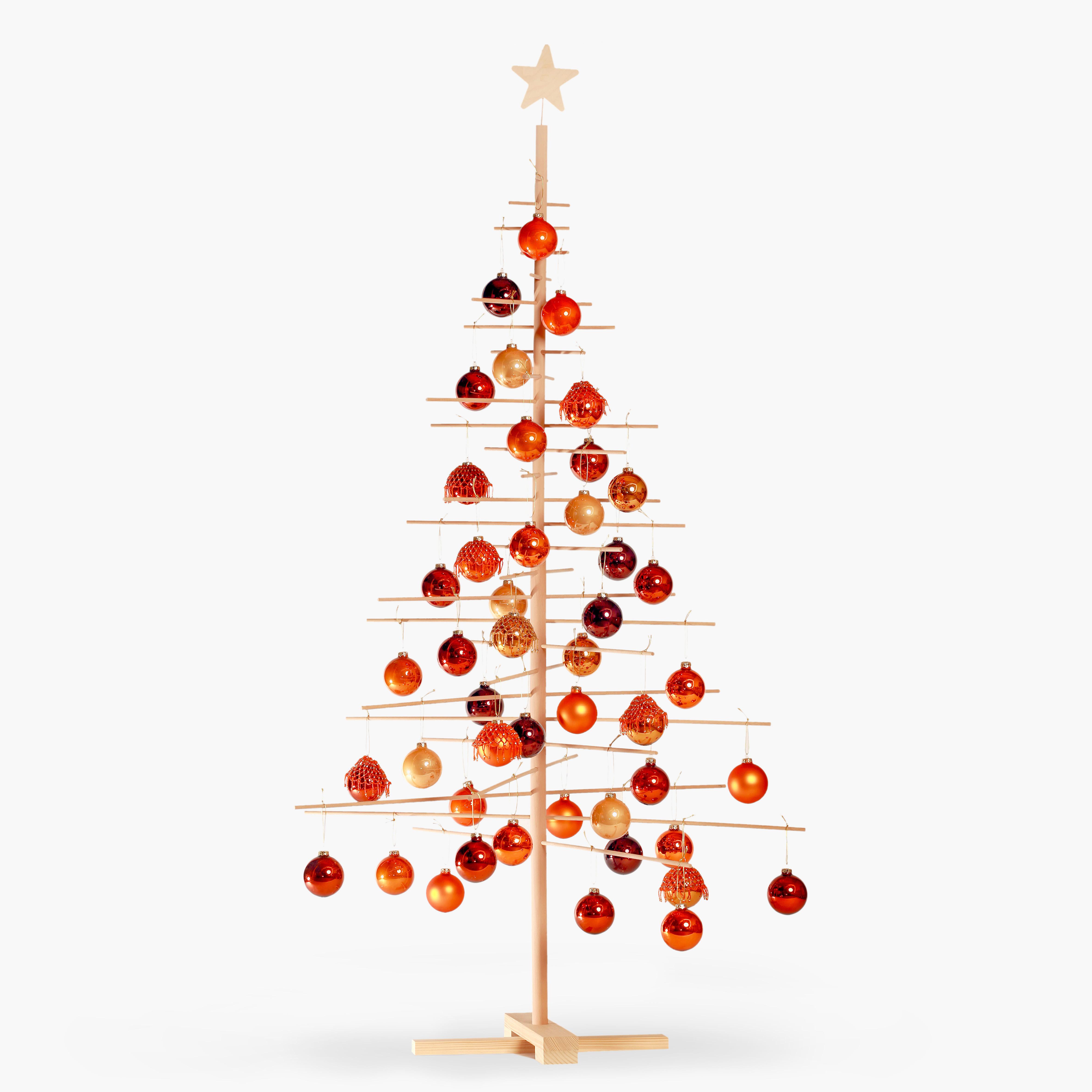 Es soll natürlich nichts gegen den traditionellen Weihnachtsbaum mit grünen Nadeln und dem entsprechenden Duft gesagt sein. Vielleicht ist aber einmal etwas Abwechslung gefragt und da bietet sich dieses Naturprodukt aus europäischen Wäldern an. Ein Stamm und zahlreiche Äste, die sich ganz nach Wunsch schmücken lassen – das sagt eigentlich bereits viel aus über die Anforderungen, die wir an einen Weihnachtsbaum stellen. Diese Anforderungen erfüllt der von Rada Kos entworfene Dekorbaum perfekt, und zwar ohne je zu nadeln. Die Leiterin einer Schule für Kunsthandwerk und Autorin zahlreicher Bastelbücher präsentiert uns einen wandelbaren Baum: Der Stamm und die Äste aus gedämpfter Buche mit Halterung und Stern aus Kiefer lässt Christbaumkugeln, Strohsterne und andere Weihnachtsdekorationen ebenso zur Geltung kommen wie wenige Wochen später auf Wunsch Papierschlangen und Lampions für den Karneval oder danach die grüne Frühlings- und Osterdekoration. Für den Aufbau des aus heimischem, FSC®-zertifiziertem Holz gefertigten Dekorbaumes ist kein Werkzeug erforderlich, die einzelnen Teile werden einfach zusammengesteckt. Dabei passen die Äste als Querstreben durch die vorgebohrten Löcher im Stamm.