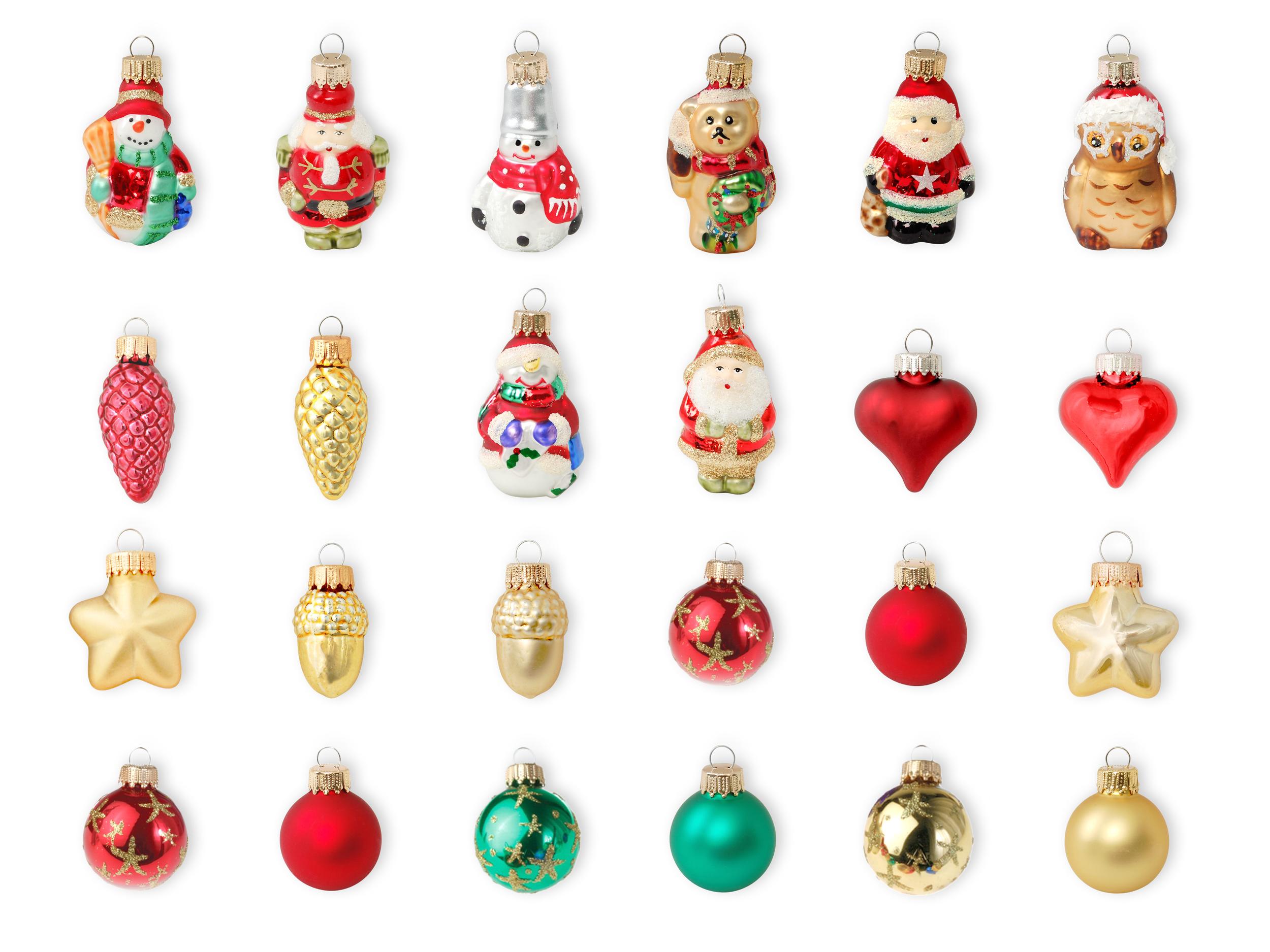 Adventskalender Haus zum Selberbauen mit 8 Stück Glasfiguren 5cm, 4 Stück Minikugel Uni satin 4cm, 4 Stück Minikugel glanz dekoriert 4cm, 8 Stück Formen 5cm aus Glas mundgeblasen und handdekoriert + Mailbox