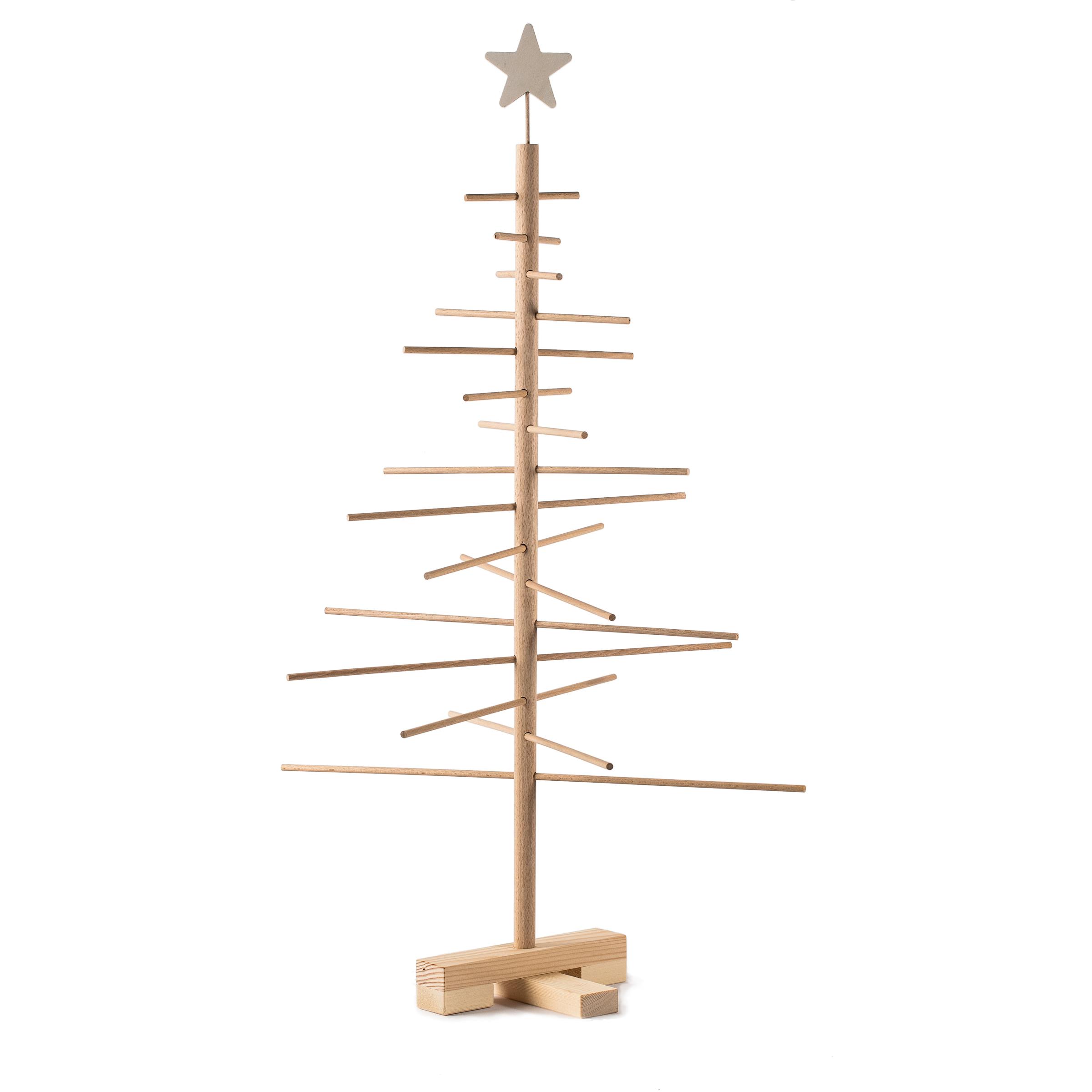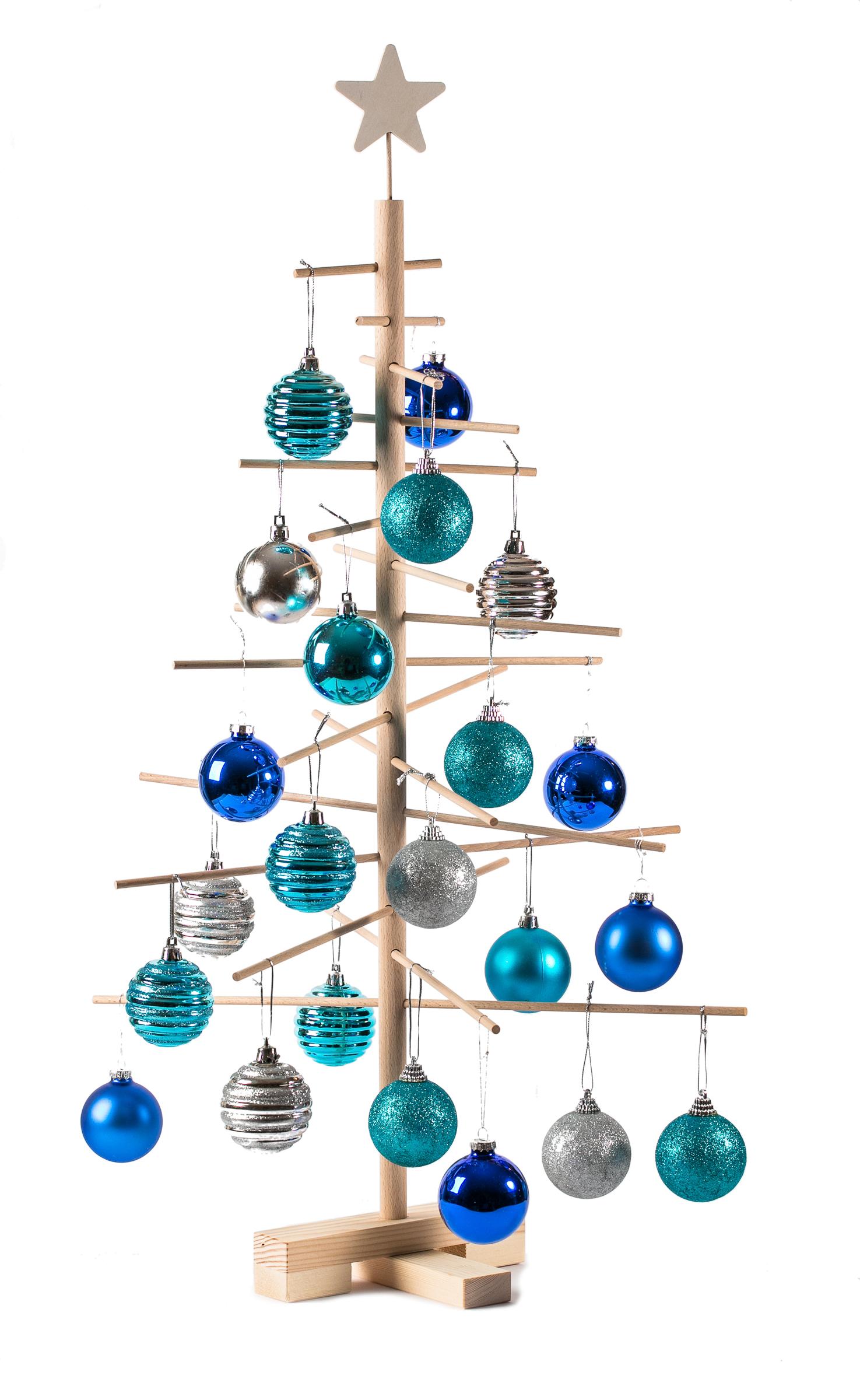 Es soll natürlich nichts gegen den traditionellen Weihnachtsbaum mit grünen Nadeln und dem entsprechenden Duft gesagt sein. Vielleicht ist aber einmal etwas Abwechslung gefragt und da bietet sich dieses Naturprodukt aus europäischen Wäldern an. Ein Stamm und zahlreiche Äste, die sich ganz nach Wunsch schmücken lassen – das sagt eigentlich bereits viel aus über die Anforderungen, die wir an einen Weihnachtsbaum stellen. Diese Anforderungen erfüllt der von Rada Kos entworfene Dekorbaum perfekt, und zwar ohne je zu nadeln. Die Leiterin einer Schule für Kunsthandwerk und Autorin zahlreicher Bastelbücher präsentiert uns einen wandelbaren Baum: Der Stamm und die Äste aus gedämpfter Buche mit Halterung und Stern aus Kiefer lässt Christbaumkugeln, Strohsterne und andere Weihnachtsdekorationen ebenso zur Geltung kommen wie wenige Wochen später auf Wunsch Papierschlangen und Lampions für den Karneval oder danach die grüne Frühlings- und Osterdekoration. Für den Aufbau des aus heimischem, FSC®-zertifiziertem Holz gefertigten Dekorbaumes ist kein Werkzeug erforderlich, die einzelnen Teile werden einfach zusammengesteckt. Dabei passen die Äste als Querstreben durch die vorgebohrten Löcher im Stamm.
